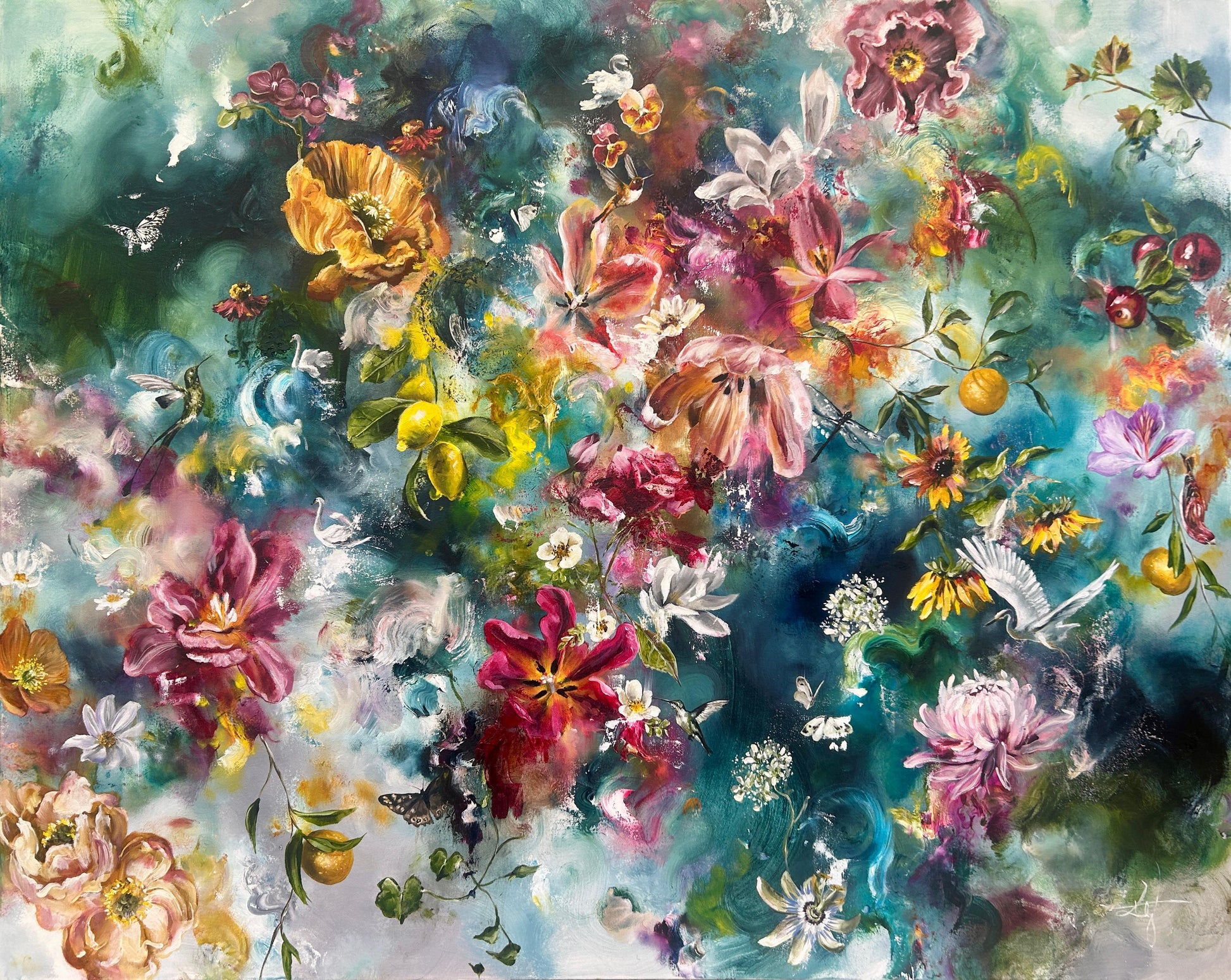 Description from Katy: A world to fall into, a wonderland to get lost within. This original oil painting takes nature as its subject, using abundant wildlife and botanicals in their natural colours, and reimagines into an abstract and mesmerising display. I wanted this piece to have movement and dynamism, captured in a stationary moment.